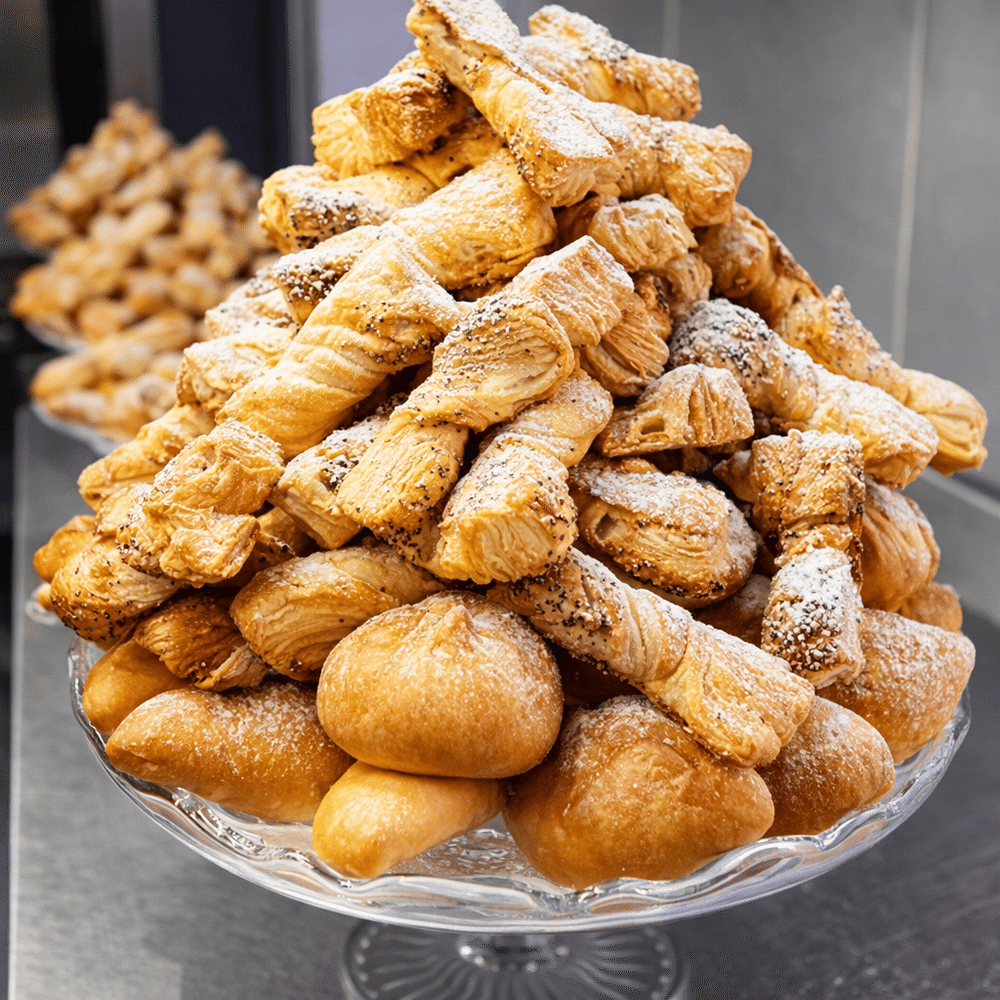Малюсенькие пирожки из воздушного дрожжевого теста с тремя начинками — сочная вишня, нежное яблоко, сладкая курага. В наборе хрустящие слоёные бантики, посыпанные сахарной пудрой. Румяные, ароматные, прямо из духовки.