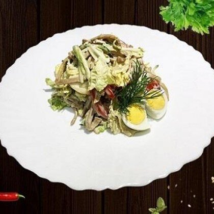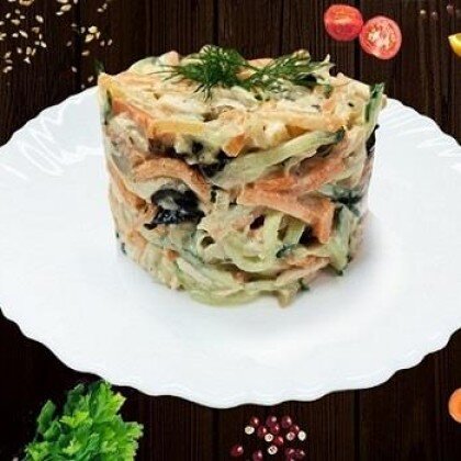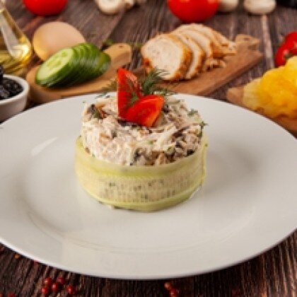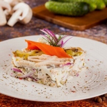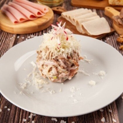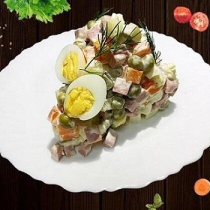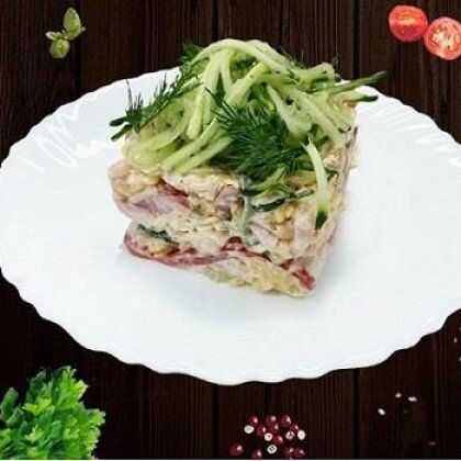 Свинина, ветчина, шампиньоны, огурчик, картофель "Пай", майонез.