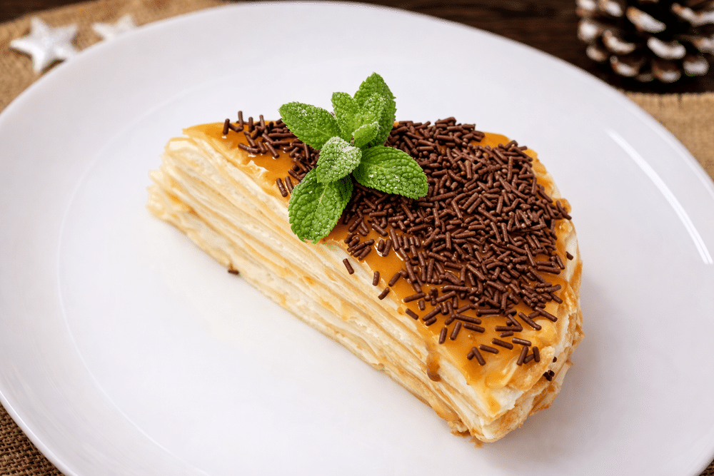 Десерт для сладкоежек: тонкие блинные слои, сметанный крем, вареная сгущенка, шоколадная посыпка.