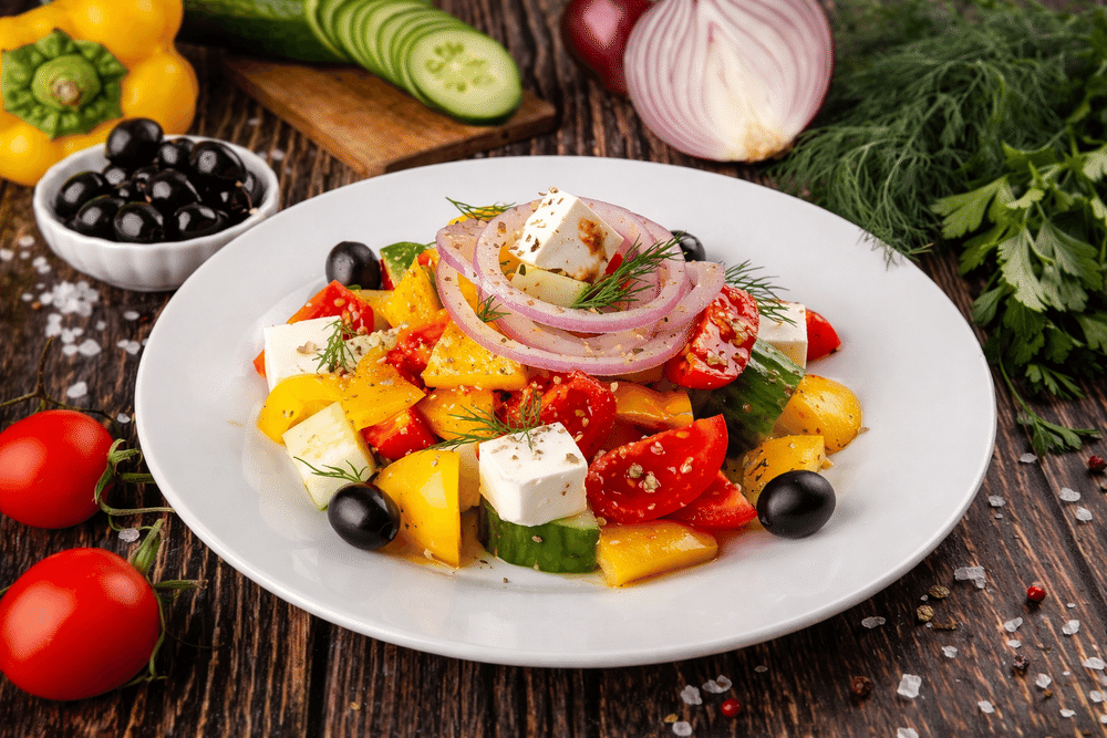 Помидорки, огурцы, перчик болгаркий, лук, маслины, соус.
