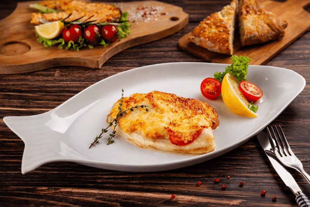 Нежное филе тилапии с томатами под сырной корочкой.
