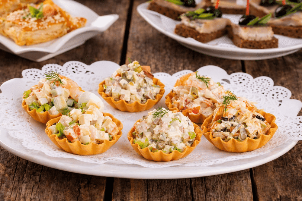 Хрустящая тарталетка с салатной начинкой. Удобно, аккуратно, в один укус.