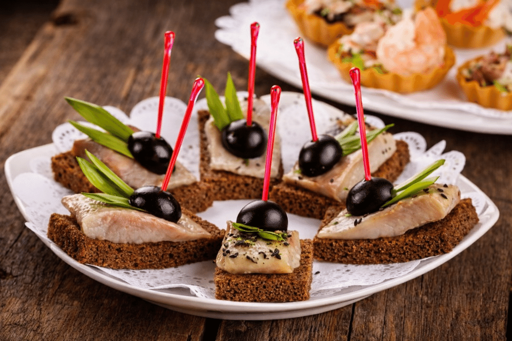 Миниатюрный бутерброд с нежной сельдью. Классика фуршета, проверенная временем.