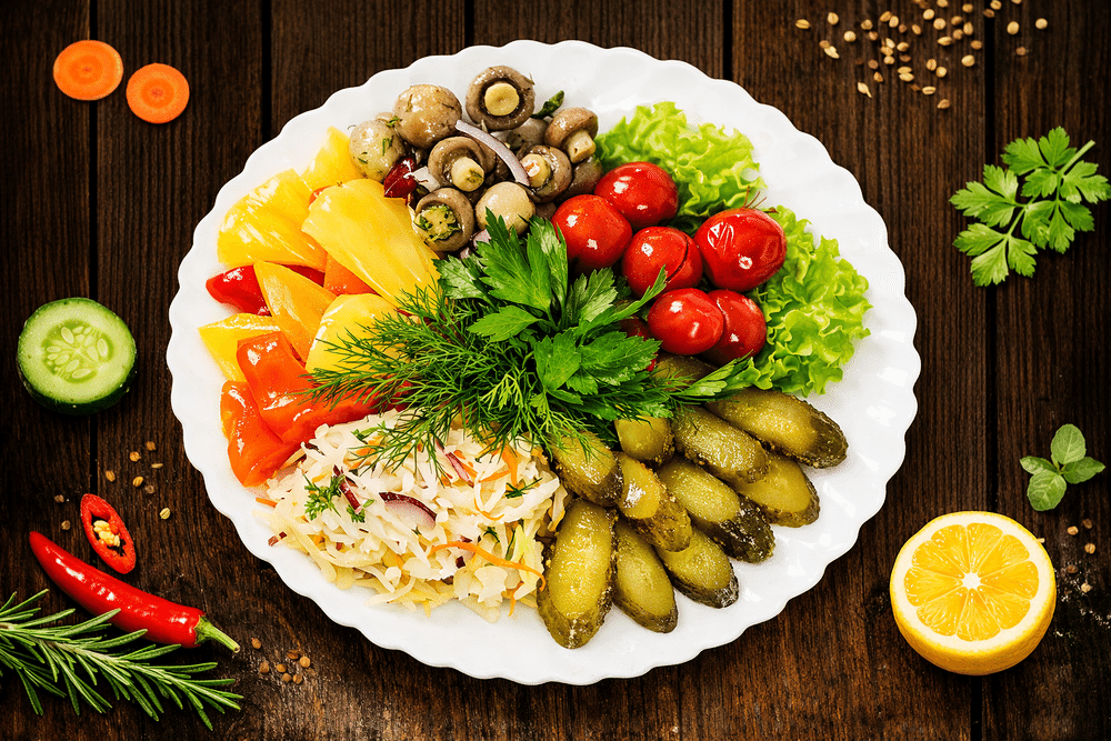 Тарелка с ассорти из маринованных огурчиков-корнишонов, помидорок-черри, перчика болгарского, капусточки квашенной и маринованных шампиньонов.