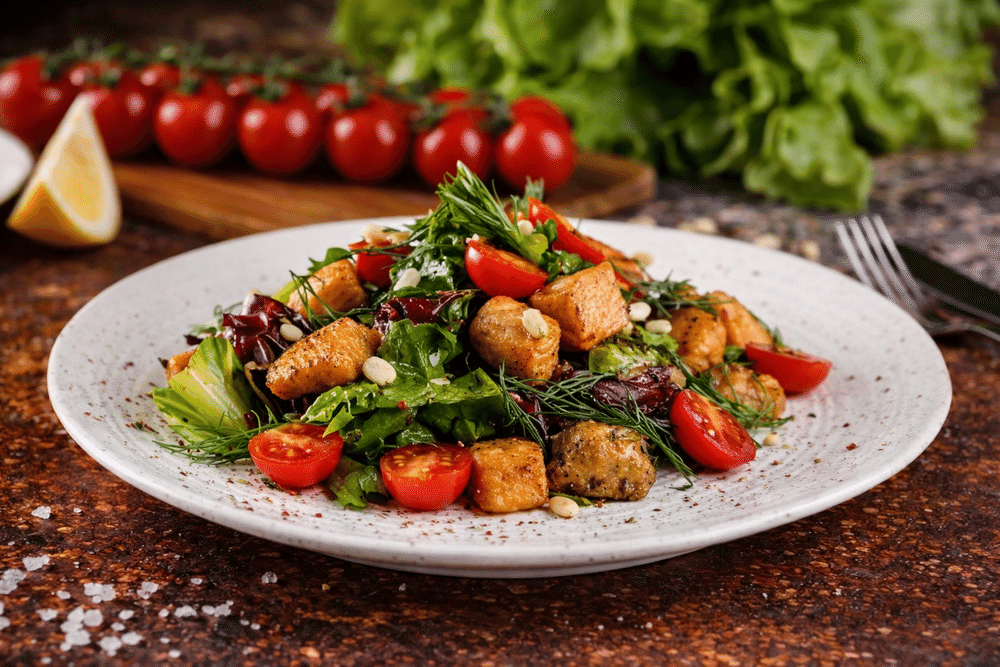 Овощной салат с мясом, помидорками, листьями салата.