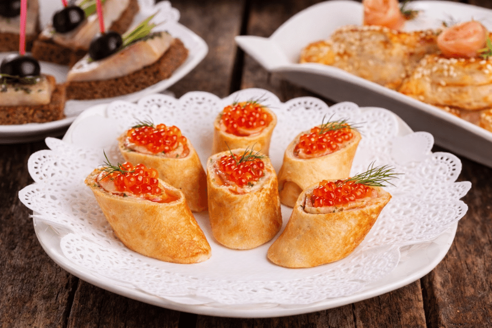 Рулетики из блинчиков с семгой и икрой