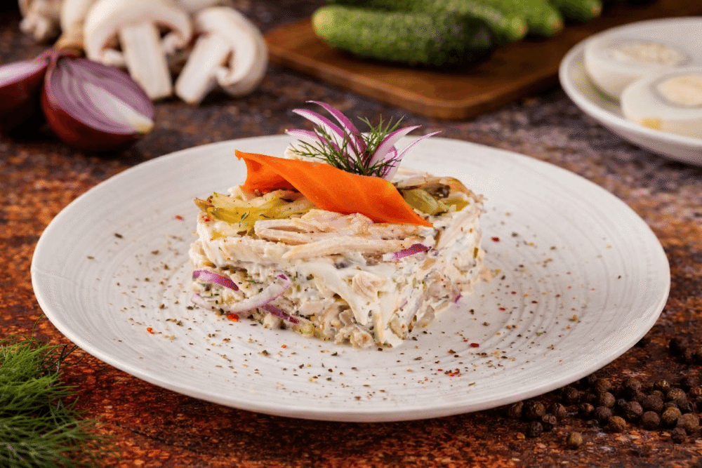 Нежный слоёный салат с курицей, грибами и маринованным огурцом.