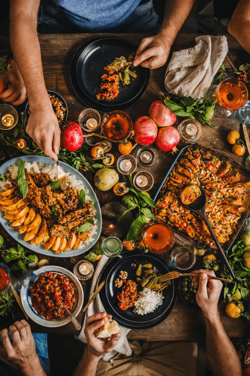 Полный праздничный стол на компанию 8–10 человек: мясное ассорти и куриные рулеты, сельдь по-русски с картошечкой, рулетики из баклажанов и ветчины, салаты «Шапка Мономаха» и «Шахеризада», хрустящая самса, шашлык из свинины и курицы, картофель по-деревенски и сочные манты.