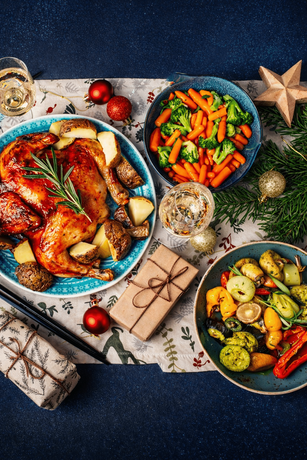 Полный праздничный стол на 8–10 человек: мясное и сырное ассорти, куриные рулеты, царская курочка, сельдь по-русски с картошечкой, рулетики из баклажанов и ветчины, три фирменных салата — «Семь морей», «Обжорка» и «Фантазия», шашлык из свинины и курицы, картофель по-деревенски, манты и румяные пирожки с мясом и капустой.